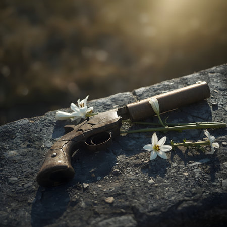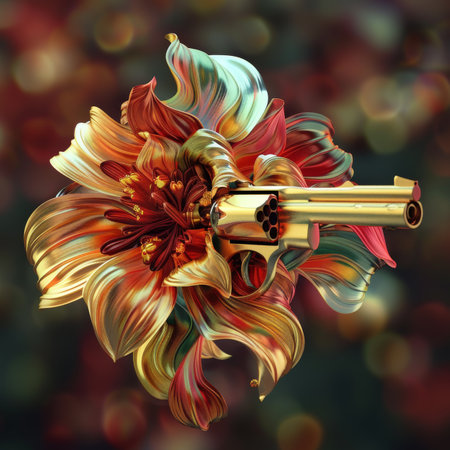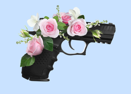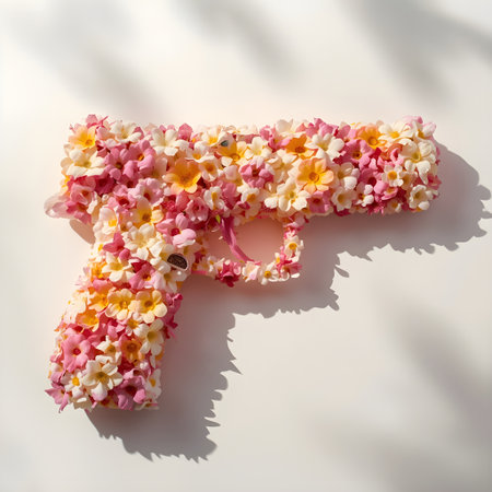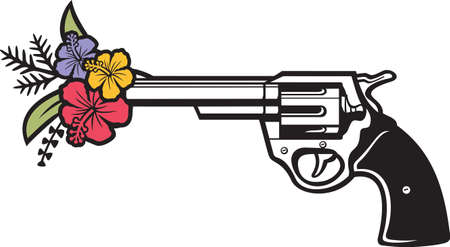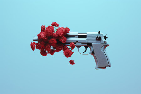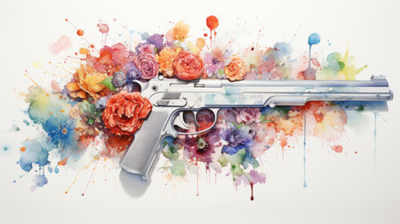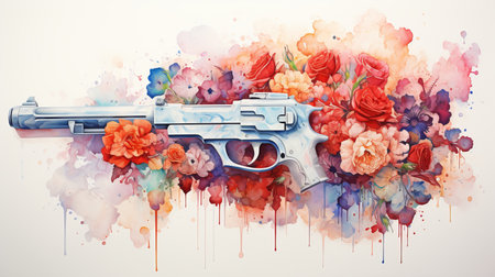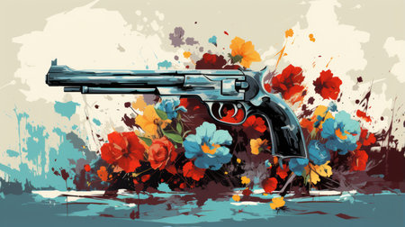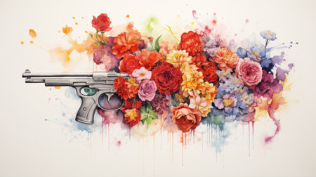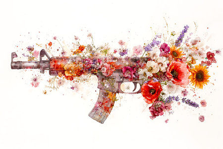 This artistic illustration features a gun intricately decorated with vibrant flowers, symbolizing the clash between violence and nature's beauty.