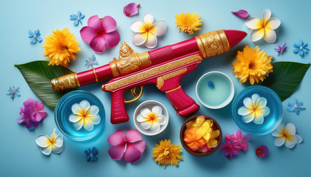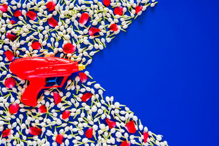 Water gun for Thailand Songkran festival celebration on blue empty background with jasmine and rose petal.