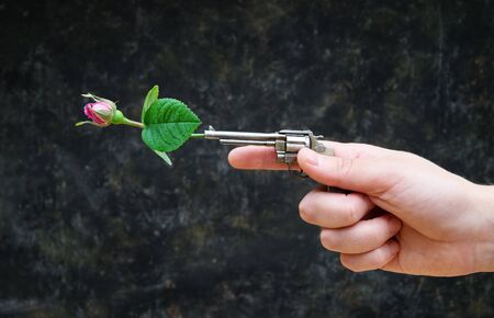 Female hand holding a miniature revolver with a red rose placed into the barrel against a dark grunge