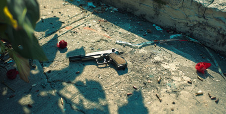 Crime tool with A discarded firearm lies on the ground, evidence marker nearby AI generated
