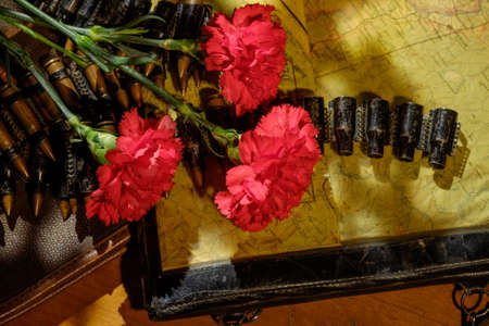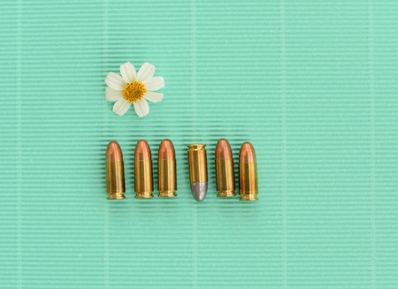 Bullets and cartridge case with beautiful flowers on gray table against dark background. Space for text