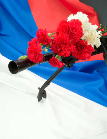 Assault rifle among beautiful flowers on white background. Stop violence, make peace