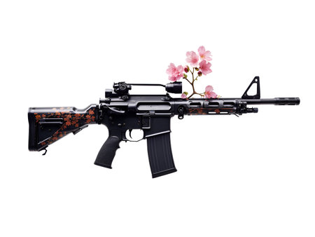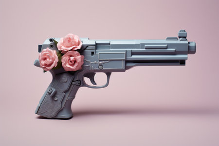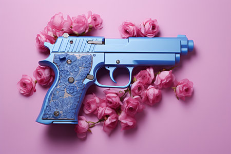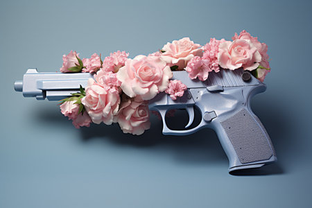 Gun in Flowers, Blurred Background, Peace Weapon Design, Generative AI Illustration