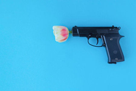 gun shoots pink tulip on blue background. concept of no war, stop the war, world peace. top view, flat lay, creative