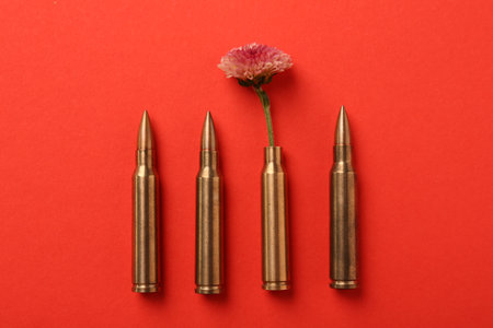 Bullets and cartridge case with beautiful flower on red background, flat lay