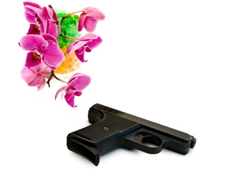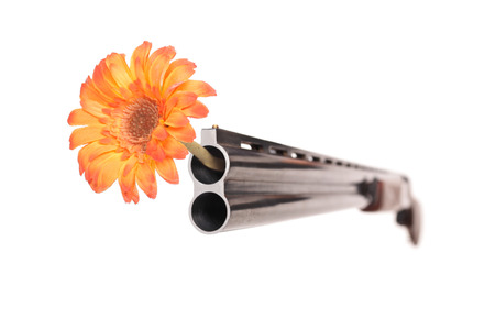Studio shot of a shotgun with a flower in its barrel with the focus on the flower isolated on white background