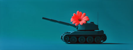 A green toy tank holds vibrant pink flowers, creating a unique contrast on a solid teal background. The playful setup combines military and nature themes in an artistic way.