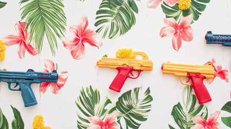 A vibrant arrangement of colorful water guns on a tropical floral backdrop. The lively scene evokes summer fun and playfulness, perfect for seasonal themes.