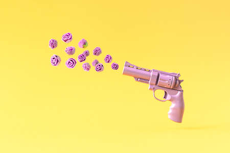 Pink gun firing pink flowers against yellow background. Piece minimal concept. Creative peace composition.