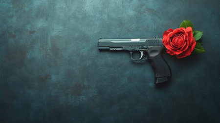 Flat lay for the world, on a black background gun and rose flowers, simulating a shot
