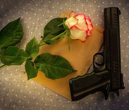 Black pistol, gun next to a red rose on a white background. The concept of passion and hatred. The choice is black or white.
