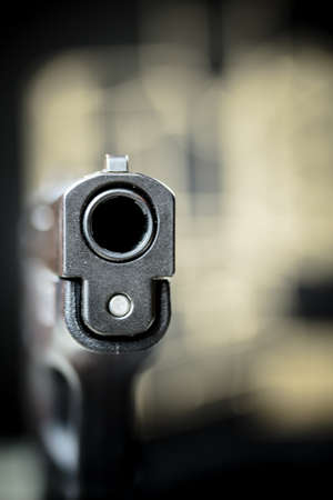 Close-up of gun barrel. Firearms in shadows. Crime or defense. Black pistol in hand.