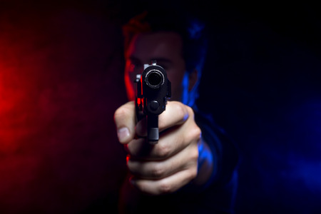 Male hand holding gun on black background with smoke toned back lights. Silhouette of a gun in hand. Crime concept. Selective focus
