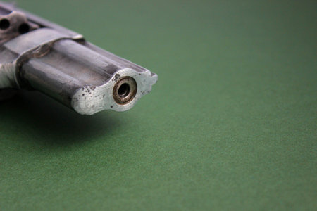 Macro view of the muzzle and front sight area of a revolver against a green surface. High detail metal texture for crime and security concepts.