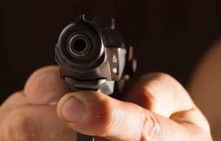 Hand with gun pointing forward close up