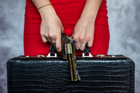 Close-up of a leather bag from which a man takes a gun. arms dealer