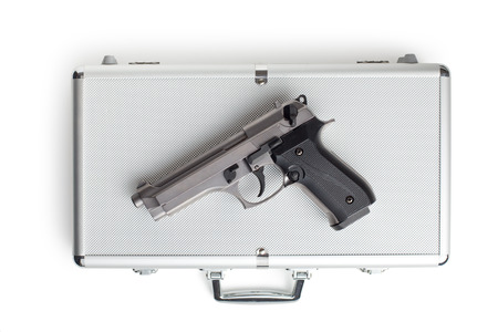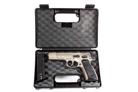 Cartridges. Pistol. The gun next to the cartridges. Weapons Suitcase for the pistol. Buying weapons. Cartridges of different calibers next to the pistol. Case for weapons. Gun storage. Collection gun
