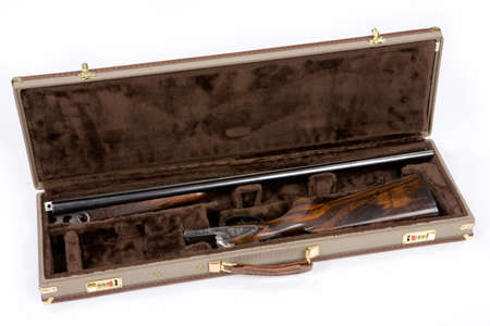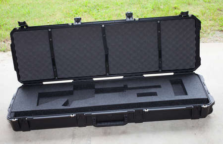 Modern firearm in strong transporting container. Army weaponry, killer sniper rifle shotgun. Generative AI