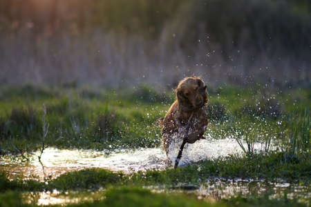 the wet dog on nature. Springer Spaniel plays in nature. Fog, morning.