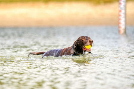 Detailed German Shorthaired Pointer. The dog swims in the blue lake with a yellow tennis ball in its mouth. During a summer day.