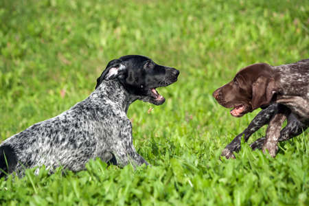 german shorthaired pointer, kurtshaar two spotted little puppy, black and brown in a white spot, playing on the grass together, funny muzzles, sunny day, bright photo