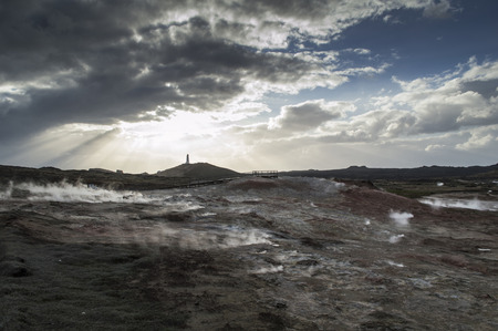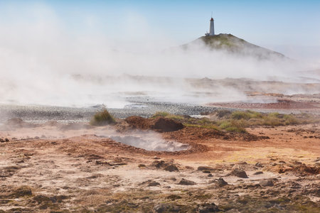 Lighthouse in the Geothermal field of Gunnuhve, Iceland. Gunnuhver is a geothermic area in Iceland, the ground is boiling hot and there are vents and fumaroles with hot sulfuric steam.