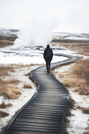 Man walking on a wooden boardwalk in Iceland in cold winter.