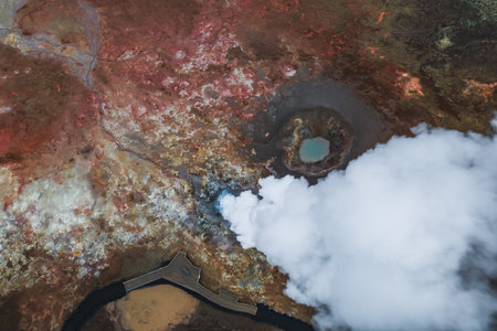 Aerial view of turquoise hot spring and silica veins in Iceland