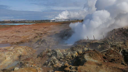 Geothermal area, hot steam, solfataras and hot gray mud cauldrons. Krisuvik, western Iceland. Reykjanesfolkvangur Peninsula.