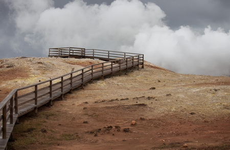 Iceland geothermal zone Namafjall - area in field of Hverir. Landscape which pools of boiling mud and hot springs. Tourist and natural attractions.