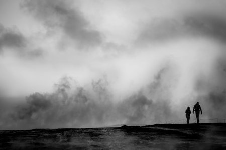 a geyser fills the air of an Icelandic volcanic landscape with water steam, creating a sense of mystery and adventure. The scene is both beautiful and eerie