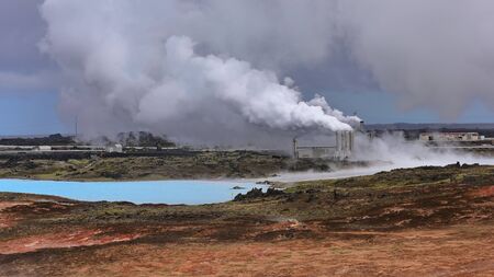 Lots of smoke in the sky created by the geothermal power plant to generate electricity - natural resource of Iceland in black and white
