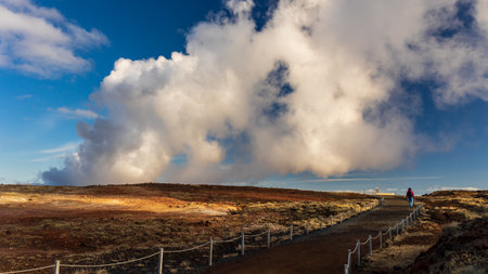 Namafjall Hverir geothermal area in Iceland. Stunning landscape of sulfur valley with smoking fumaroles and blue cloudy sky, travel background, tourist attraction