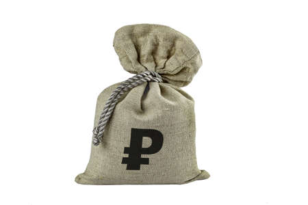 The Russian ruble, the symbol of currency is applied to a textile bag filled, isolate.