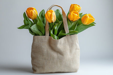 Reusable shopping bag made of fabric with a bouquet of yellow tulips on a white background. Spring mood. Perfect for promoting sustainable and fashionable alternatives.