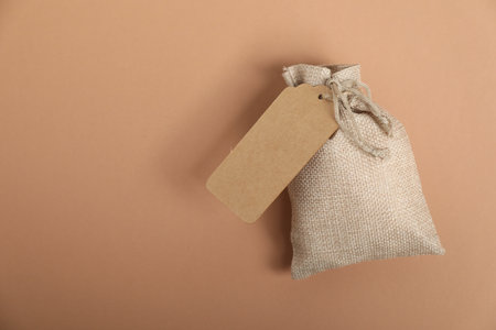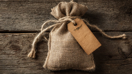 A burlap sack tied with twine sits on a light wooden surface in a softly illuminated space. The sack features a blank tag for customization, emphasizing rustic charm