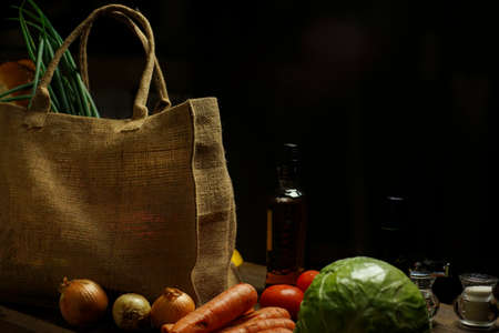eco bag made from natural burlap with food and vegetables stands on a wooden table. Eco concept.