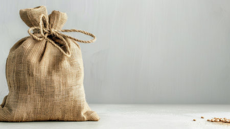 A rustic burlap sack, tied at the top, sitting on a textured surface, evoking a sense of tradition and simplicity.