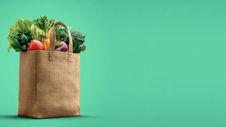A reusable jute bag filled with fresh organic vegetables sits against a vibrant green backdrop, promoting sustainable shopping choices and healthy living.
