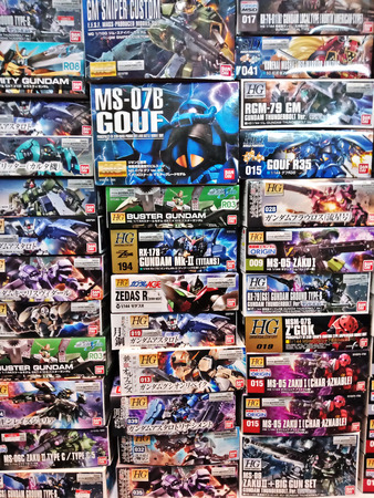 Bangkok / Thailand - March 31, 2018 : Groups of Gundam Figure box on shelf for sale