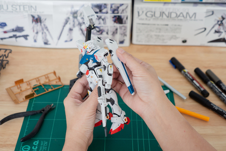 BANGKOK, THAILAND - July 30, 2018 :Hands of Asian man hand build Gundam plastic model on wood table