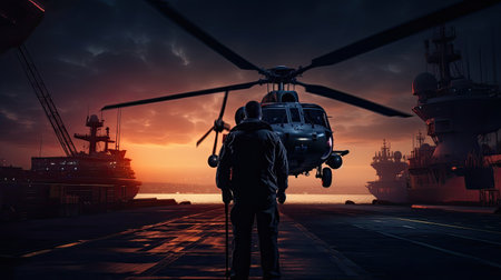 soldier on military frigate watches the helicopter take off from the deck.