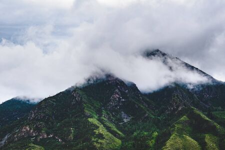 Mountains in the clouds. Caucasus, Russia. Selective focus.