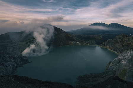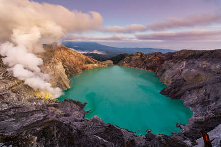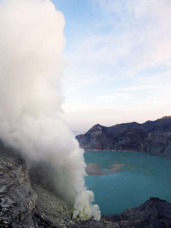 Beautiful Landscape mountain and blue lake with smoke sulfur in the morning in a Kawah Ijen volcano.