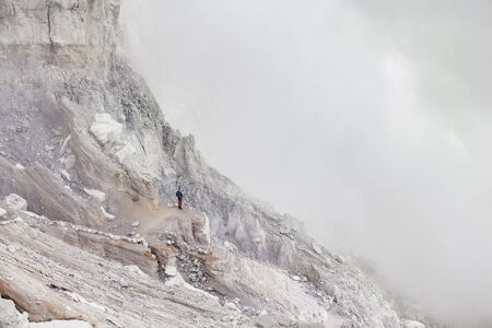 Mountain landscape in the fog. Group of people walking in the mountains. Way to Kawah Ijien volcano in Indonesia. Hiking and trekking travel concept. Soft focus, film grain