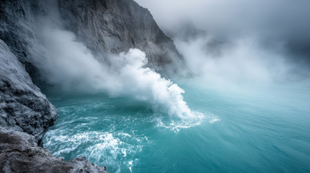 A breathtaking view of a geyser erupting into the turquoise ocean waters near a rocky cliff, enveloped in mist and fog at dusk.