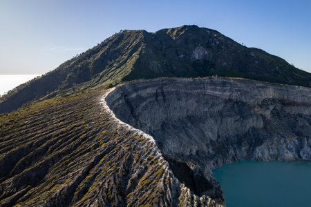 Aerial view of rock cliff at Kawah Ijen volcano with turquoise sulfur water lake at sunrise. Panoramic view at East Java, Indonesia. Natural landscape background.