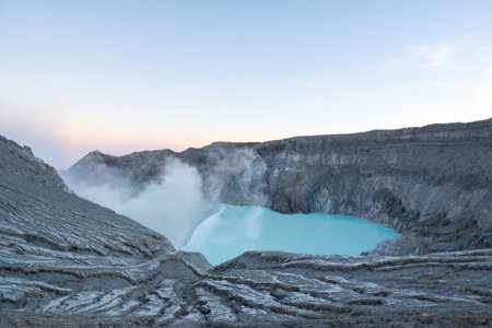 Turquoise sulfur lake of kawah ijen volcano crater emitting smoke at dawn, indonesia