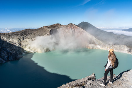 Young woman in protective mask on summit of active volcano Kawah Ijen above crater acid lake with poisonous fume. Popular travel destination, adventure hike on family vacation in Bali, Java, Indonesia