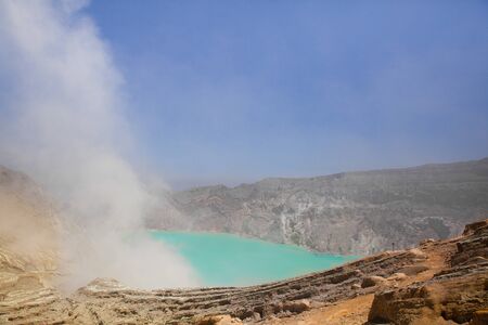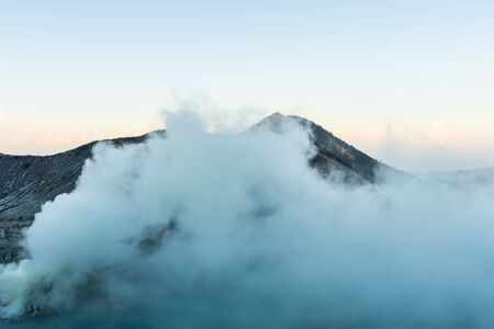 Sulfur smoke rising from Ijen crater over acid lake in Java island Indonesia